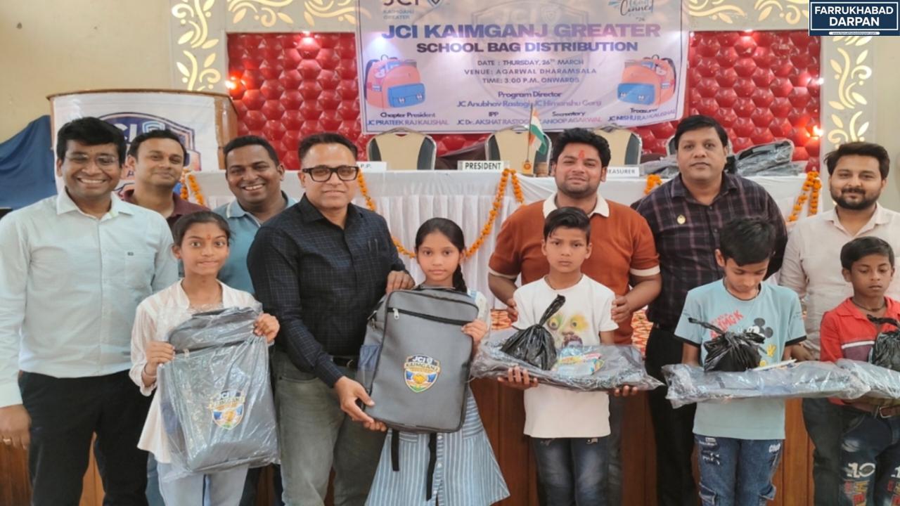 जनपद फर्रुखाबाद के कायमगंज नगर के अग्रवाल सभा भवन में एक भव्य कार्यक्रम का आयोजन किया गया। यह कार्यक्रम जेसीज क्लब की ओर से आयोजित किया गया था, जिसका मुख्य उद्देश्य शिक्षा को बढ़ावा देना और जरूरतमंद बच्चों की मदद करना है। क्लब के पदाधिकारियों ने नगर के प्रमुख स्कूलों के लगभग 150 छात्र-छात्राओं को नए स्कूल बैग भेंट किए। नया बैग पाकर बच्चों की खुशी का ठिकाना नहीं रहा और उनके चेहरे खिल उठे।
