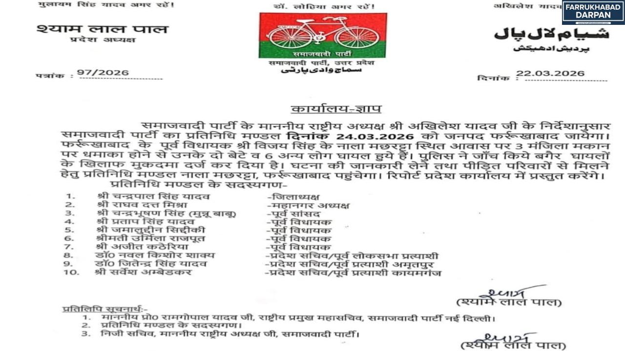 फर्रुखाबाद : अखलेश यादव के निर्देश पर पूर्व विधायक विजय सिंह के घर पहुंचेगा सपा का ‘स्पेशल 10’ दस्ता – 17 मार्च को हुआ था घर में विस्फोट